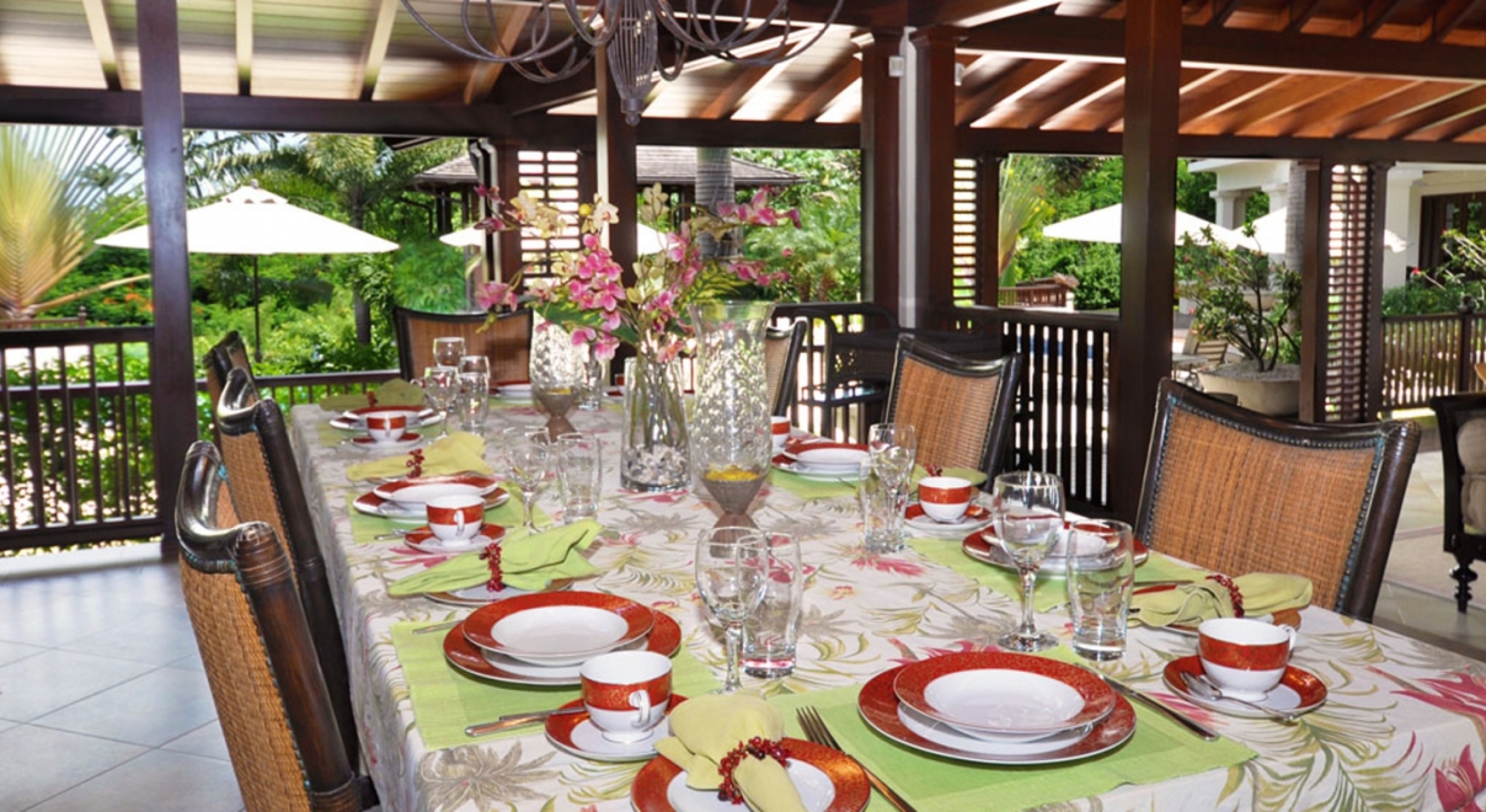 Approach the courtyard via a dark wood walkway overlooking a meandering Oriental koi pond and relax in the breezy lounge, or enjoy a meal prepared by your private chef in the elevated dining area that comfortably seats 8-10 people.
